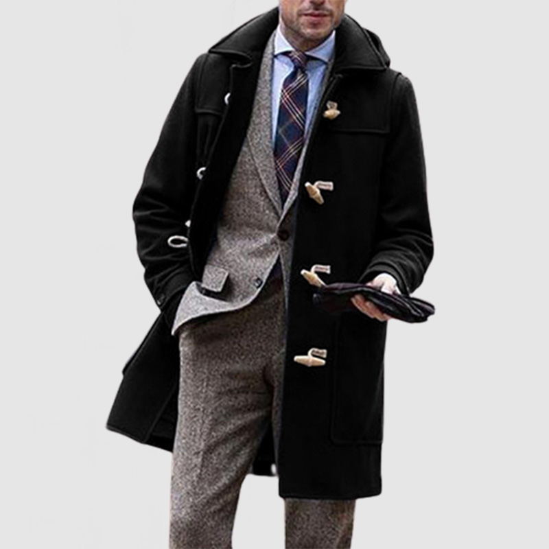 Men's Elegant Horn Button Wool Hooded Coat